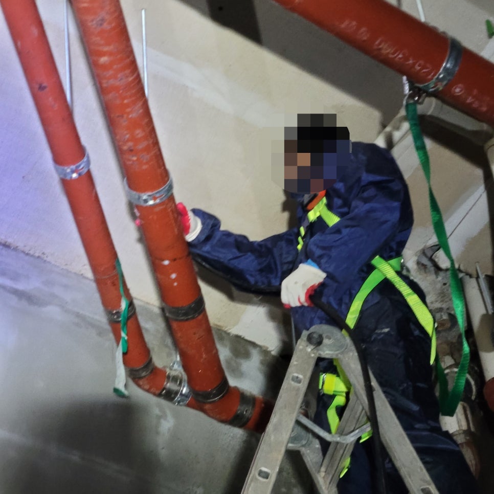 구미 수전 없던 위치에 급수 배관 신설 후 수전 설치. 복잡한 천장 내 배관 경로 정밀 계획, 행거 고정으로 장기 안정성 확보. 급수 펌프까지 한 번에 설치 완료.
