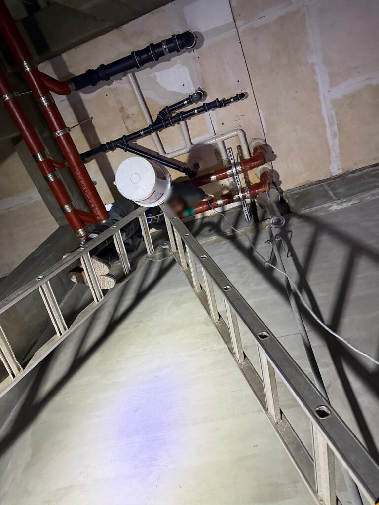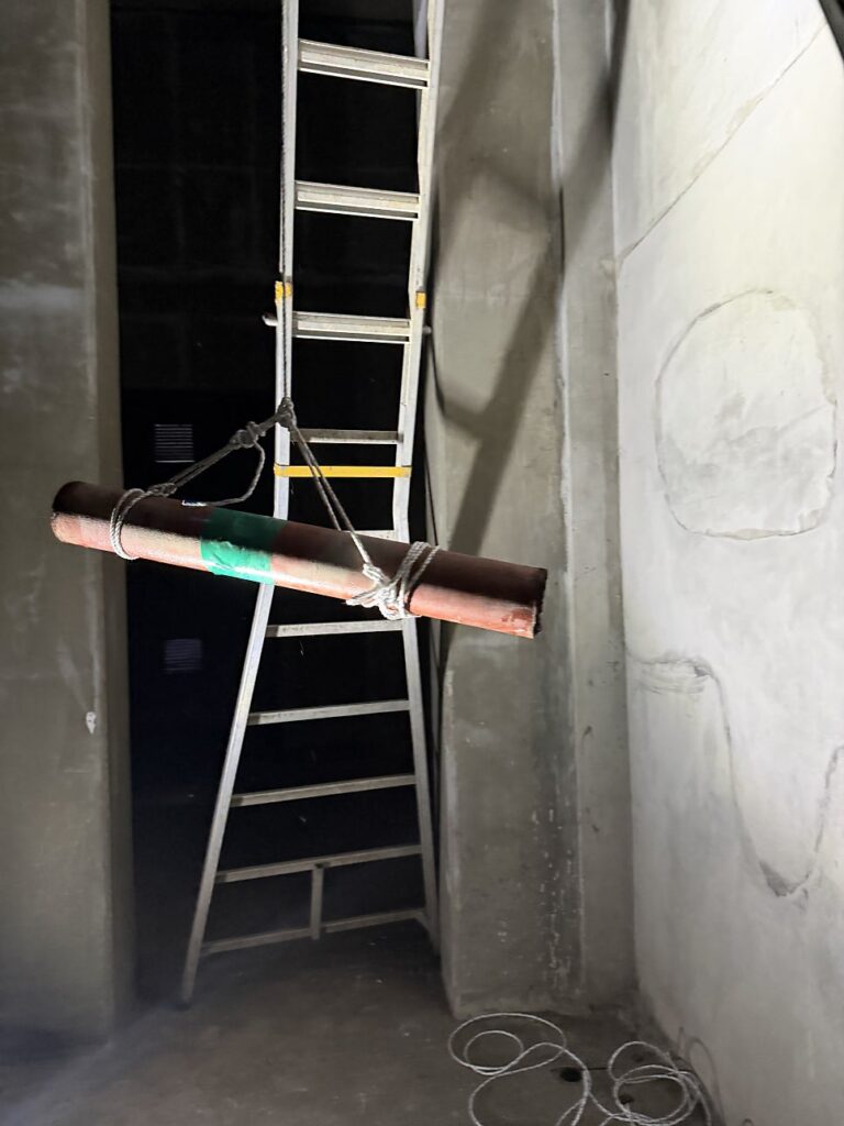 첫 번째 단계는 노후 주철 오수배관 일부 절단이었다. 새 배관이 정확히 들어갈 수 있도록 주철배관을 절단하고, 제거한 배관은 줄에 매달아 안전하게 하강시켰다. 고소 작업인 만큼 기산홈서비스 시공팀의 팀워크가 돋보인 단계였다.