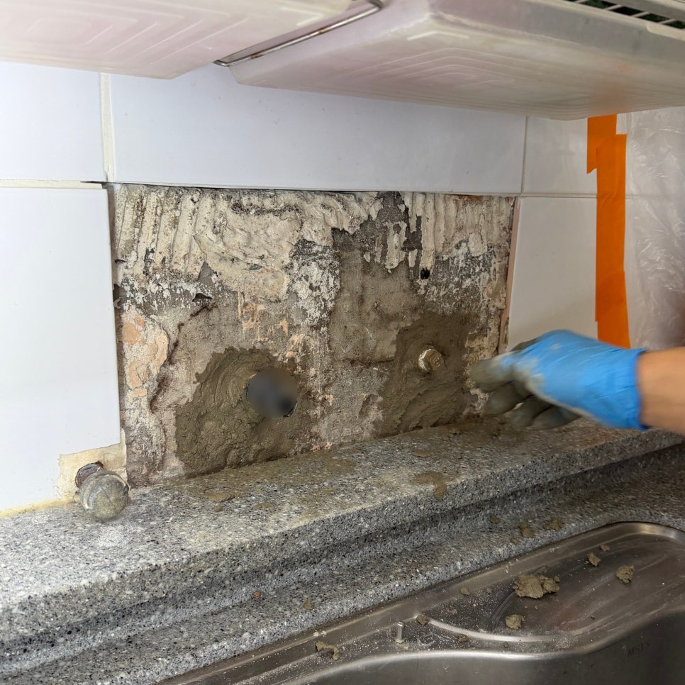 단순 표면 점검으로는 정확한 상태 파악이 불가능했다. 기산홈서비스는 각 배관을 정밀 확인하기 위해 벽면 굴착을 결정했다. 기산홈서비스 관계자는 “수전 주변 누수는 수전 자체보다 뒤에 연결된 급수 배관 상태를 먼저 확인해야 한다”며 “매설 배관 노후화를 모르고 수전만 교체하면 얼마 지나지 않아 같은 문제가 반복된다”고 전했다.