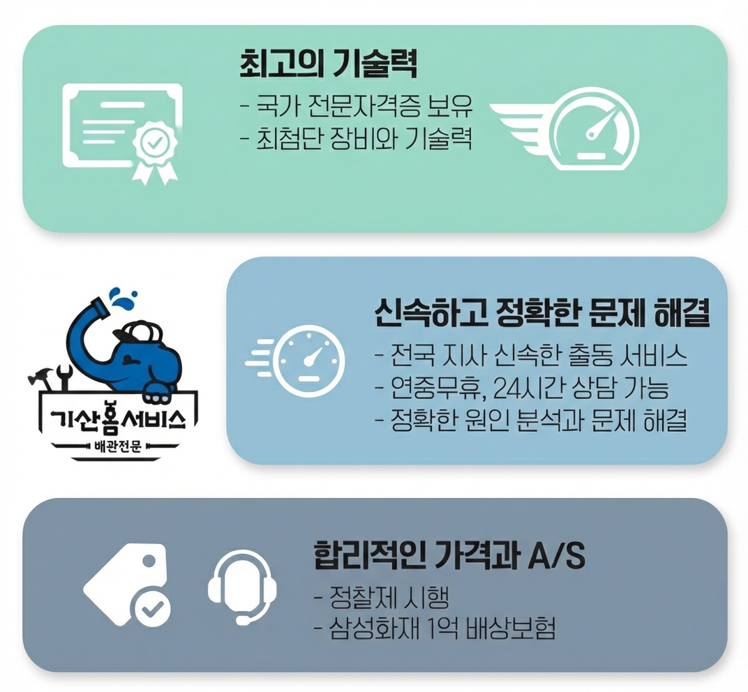 ㈜기산홈서비스는 이러한 업계의 문제를 해결하기 위해 설립되었습니다. 국가공인 배관 전문가로 구성된 저희 팀은 누수, 막힘, 역류 등 모든 배관 문제의 근본 원인을 정확히 진단하고, 첨단 장비와 숙련된 기술력으로 완벽하게 해결합니다.