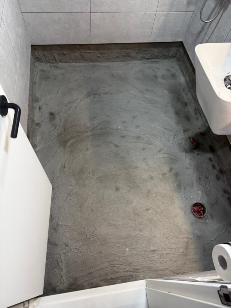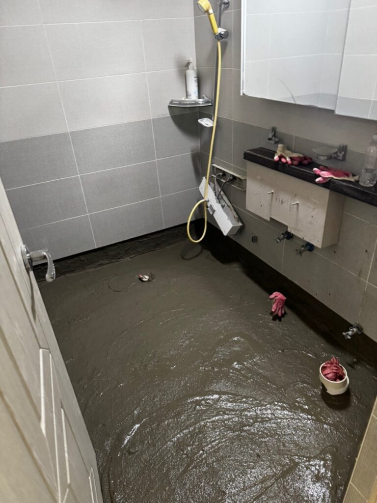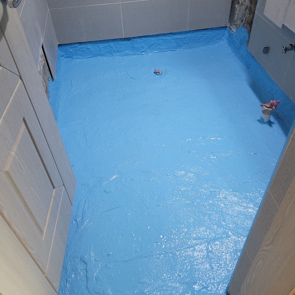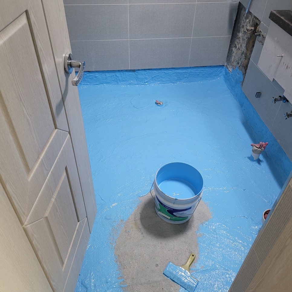 이어 1차 방수액인 몰탈 방수제를 도포했다. 몰탈 방수제는 물을 튕겨내는 성질이 있어 욕실 바닥으로 흐르는 물이 바닥으로 스며들지 않고 하수 배관 방향으로 흐르도록 유도하는 역할을 한다.