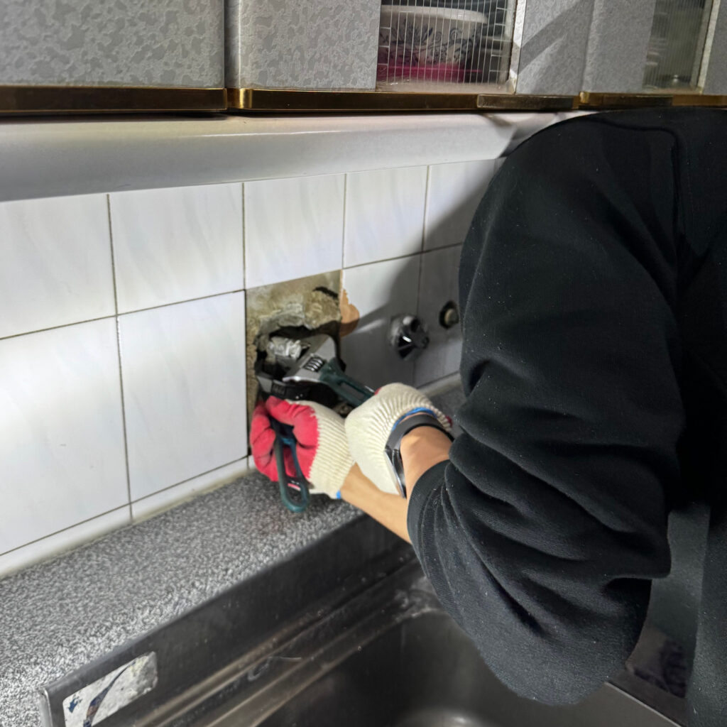 현장에 도착한 기산홈서비스 구미점 작업팀은 먼저 육안 점검을 실시했다. 주방 싱크대 벽면에 설치된 벽 수전은 외관상 큰 문제가 없어 보였지만, 수전 하부 배관 연결부를 살펴본 결과 온수 배관 부속 일부가 손상되고 연결 상태가 느슨해진 것으로 확인됐다.