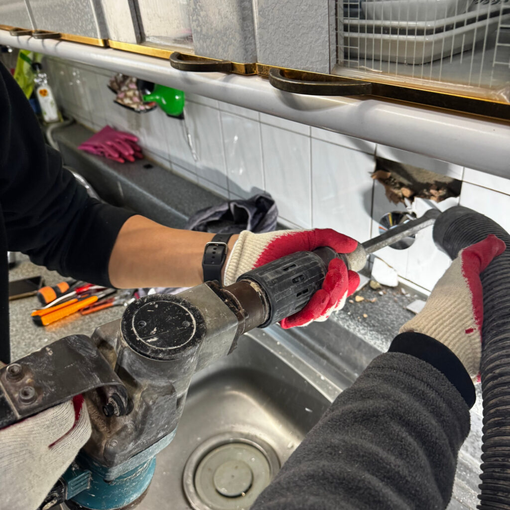 이 과정에서 주목할 점은 분진 관리였다. 일반적으로 타일을 깨고 벽체를 뚫는 작업은 많은 분진과 파편이 발생하기 마련이다. 하지만 작업팀은 석션(흡입장비)을 드릴 바로 옆에 밀착시켜 작업하며 분진이 주방 공간으로 날리는 것을 원천 차단했다.